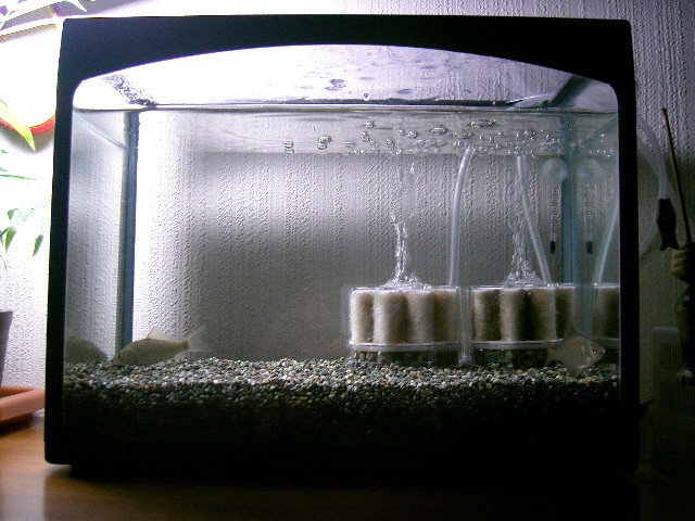 ろ過装置は水作エイトS×2(1つのエアポンプから分岐させています)。30cm水槽にはさすがに圧迫感があります・・・(苦笑) ろ材が茶色になるのはバクテリアがついてきた証拠らしいので、いい感じに変色してきたかな~と思っています。