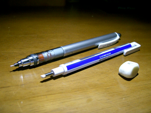 現在の描き方では、ラフ・下描き・本描きも全て一枚の紙の上で行っており、線画は全てこの一本のシャーペンで描いています。芯はH。ノック式消しゴムは細かい部分を消すのに非常に便利です。